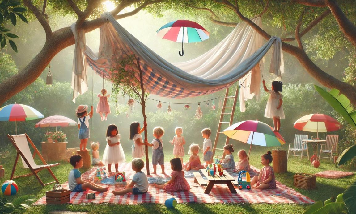 در این بخش از مقاله، به توضیح یکی از روشهای خلاقانه و ساده برای ساخت سایبان و چادر برای گریز از گرمای تابستان با استفاده از ملحفهها و چترها میپردازیم. این فعالیت نه تنها فرصتی برای سرگرمی کودکان فراهم میکند، بلکه مکانی خنک و دلپذیر برای بازی و استراحت در فضای باز ایجاد میکند.